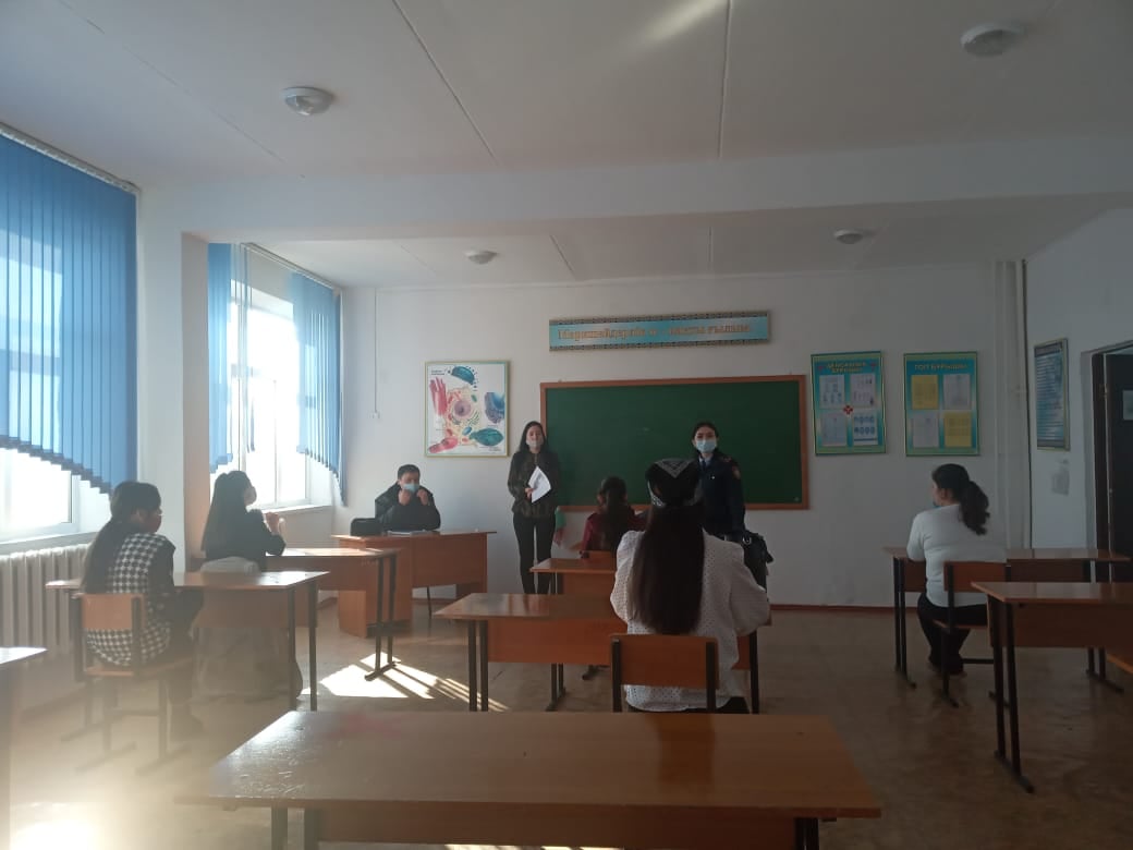 « Құқықтық білім беру, құқықбұзушылықтың алдын алу » жоспарына сәйкес колледжде АПБ-ң ЖПҚ ЮПТ-ң инспекторы А.Байшора, А.Кентаевтың , директордың тәрбие ісі жөніндегі орынбасары А.Естемесова , колледж психологы А.Есболаеваның қатысуымен колледжішілік рейд жүргізілді. Рейд барысында кәмелеттік жасқа толмаған студенттерге түнгі уақытта сағ 22.00 ден кейін көшеде ата-анасынсыз жүруіне тыйым салынғандығы туралы ескерту айтылып, бопсалау, ақша талап ету фактілерін болдырмау , оның алдын алу бойынша профилактикалық түсіндірме жұмыстары жүргізілді.