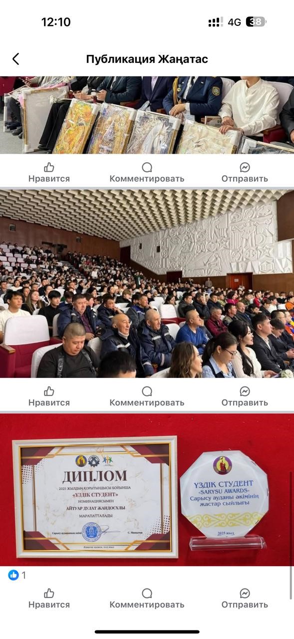 2025жылдың желтоқсан айы Сарысу аудан әкімінің "ҮЗДІК СТУДЕНТ" номинациясымен дипломымен Жаңатас көпсалалы колледжінің 3 курс студенті - Айтуар Дулат Жандосұлы марапатталды.